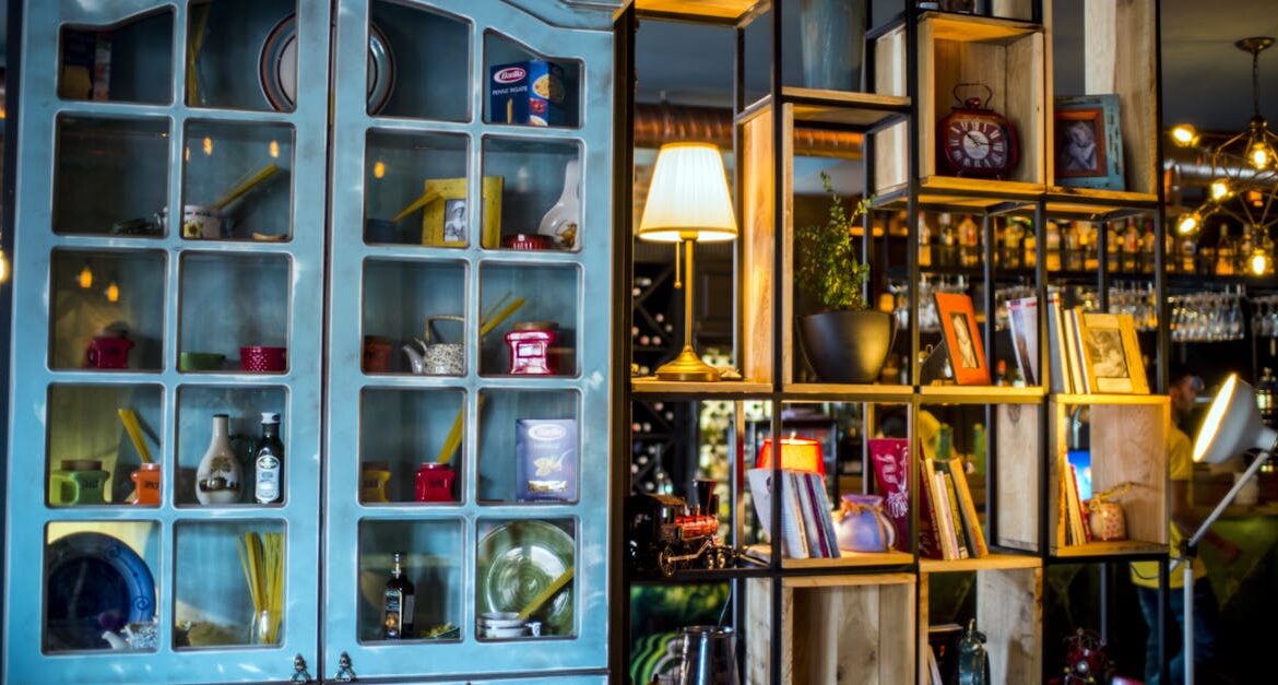 • Salon i pokój dzienny – panele akustyczne 3D, regały półkowo-akustyczne, klosze lamp.